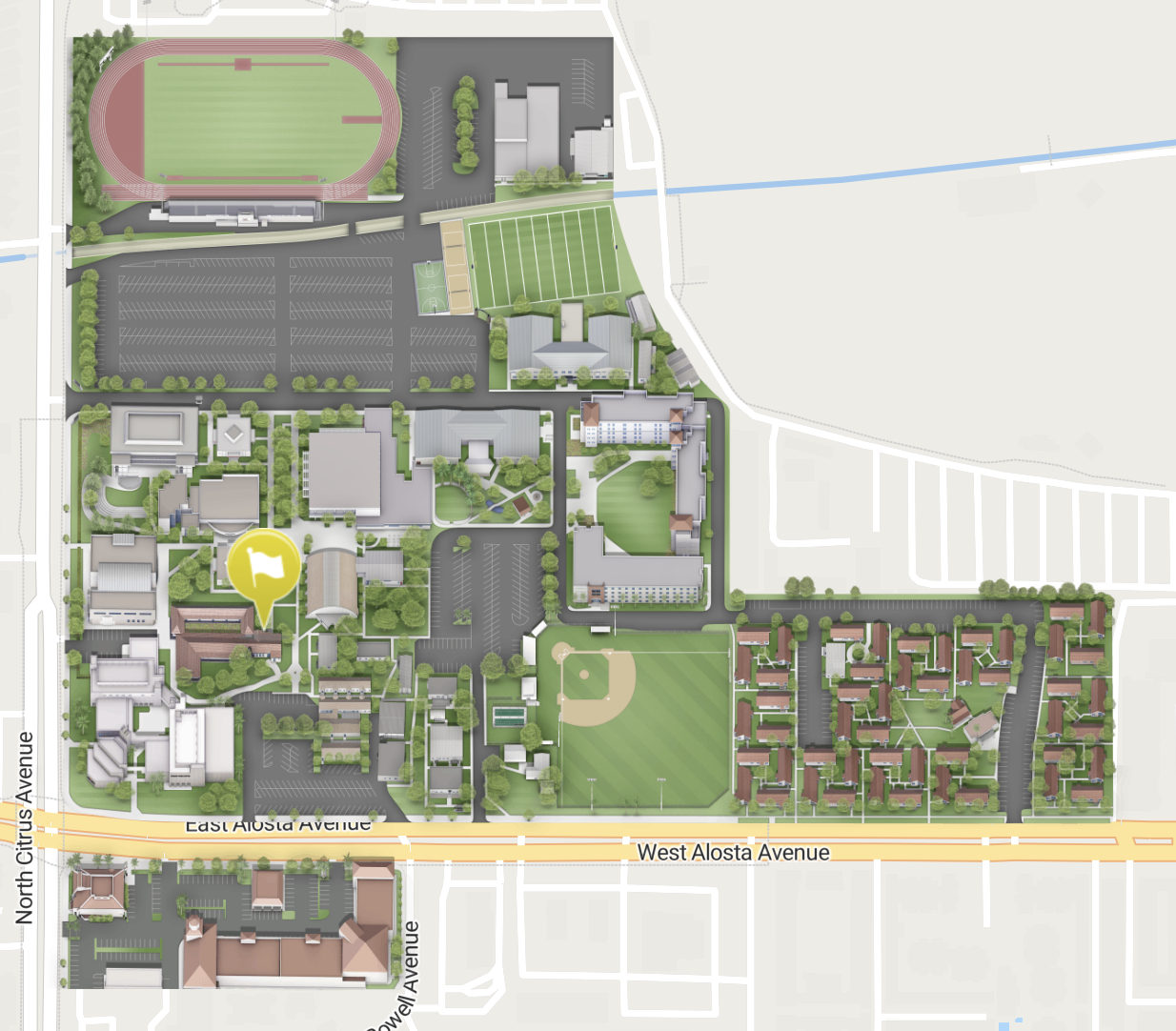 Located on East Campus, near the Rose Garden and Lot C. Most commonly referenced to as “the building with all the flags on it”.