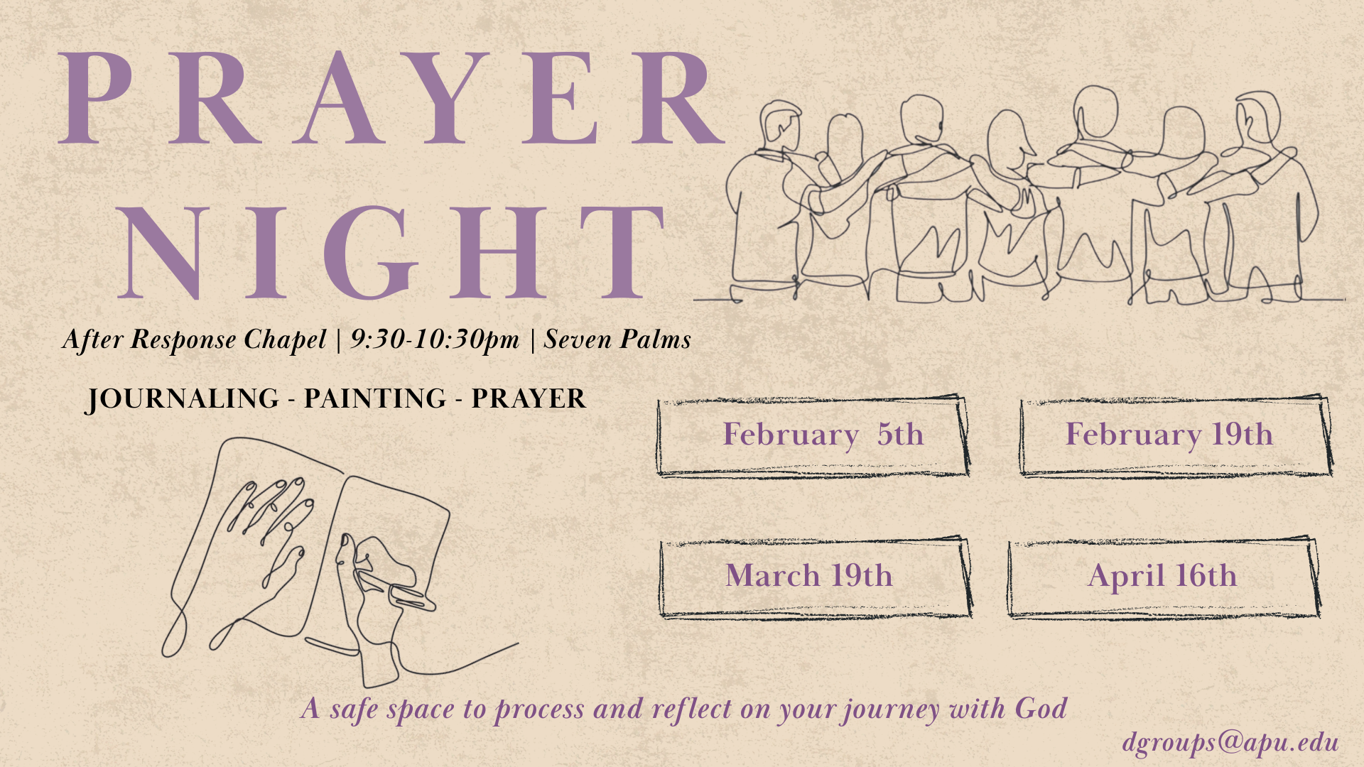 As we observe Jesus' habits, we can't ignore how often he pulled away from the crowds to meet with the Father. We believe in the power of prayer for the transformation of our own souls and the world around us. Within APU Discipleship, we offer several corporate prayer events throughout each semester, each offering varied prayer expressions. Our team also spearheads door-to-door prayer and anointing for living spaces. We can't wait to pray with you!